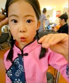 6岁的朱星潼长得十分可爱,脸颊圆润饱满,看得人只想伸手捏一把,一双大眼睛明亮有神,身穿粉色的戏服,还扎着两个俏皮的麻花辫,看着就是古灵精怪的活泼小孩。