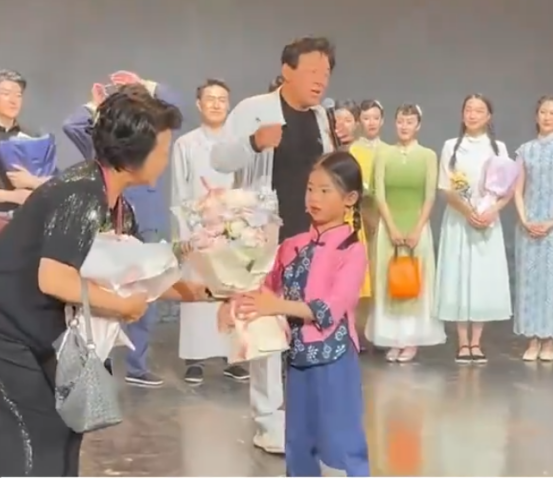 都说是隔辈亲,这话放在朱时茂夫妻和朱星潼身上真是一点没错,演出一结束,朱时茂和范旭霞就冲上舞台给孙女献花。